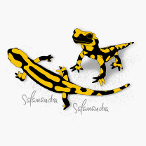 Der Feuersalamander – geheimnisvoll, faszinierend und wunderschön. Dieses Design zeigt zwei Ansichten des auffälligen Tiers: einmal von vorn, einmal von oben. Darunter steht der wissenschaftliche Name Salamandra salamandra, der dem Motiv einen ganz besonderen, naturkundlichen Charakter verleiht.