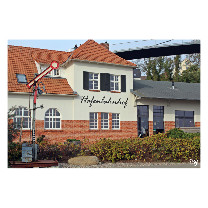 Es handelt sich um ein zweistöckiges Gebäude mit roten Ziegeln und weißen Wänden. Davor befindet sich ein Signal mit einem weißen Kreis auf rotem Grund, welches auf einen ehemaligen Bahnübergang hinweist. Im Vordergrund befindet sich ein Teil der alten Signaltechnik.