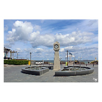 Im Mittelpunkt steht eine Uhr auf einem hohen Sockel, umgeben von einem Brunnen mit mehreren Wasserstrahlen. Im Hintergrund ist ein Teil der Seebrücke von Binz zu sehen.