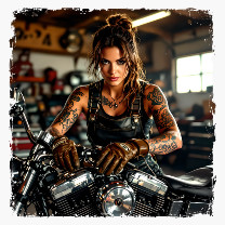 Diese Illustration bringt den Geist der Straße auf Stoff: kräftige Farben, markante Schatten und die ikonische Silhouette einer Frau, die ihre Harley liebt.