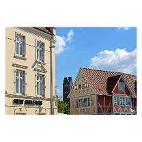 Im Vordergrund, steht das 2 stöckige denkmalgeschützte Fachwerkhaus aus dem 17. Jahrhundert. Damals gehörte das Haus zur Wehranlage und zur Stadtmauer Wismar, mit öffentlichen Durchgang.
